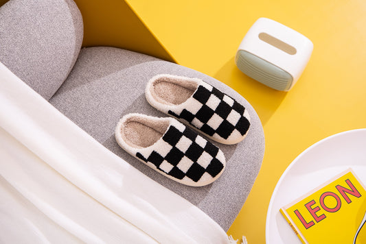 Checkered Pattern Illustrated Comfort Cozy Plush Fluffy Fur Slip On Cushion Slippers