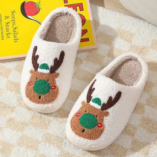 Christmas Reindeer Illustrated Comfort Cozy Plush Fluffy Fur Slip On Cushion Slippers